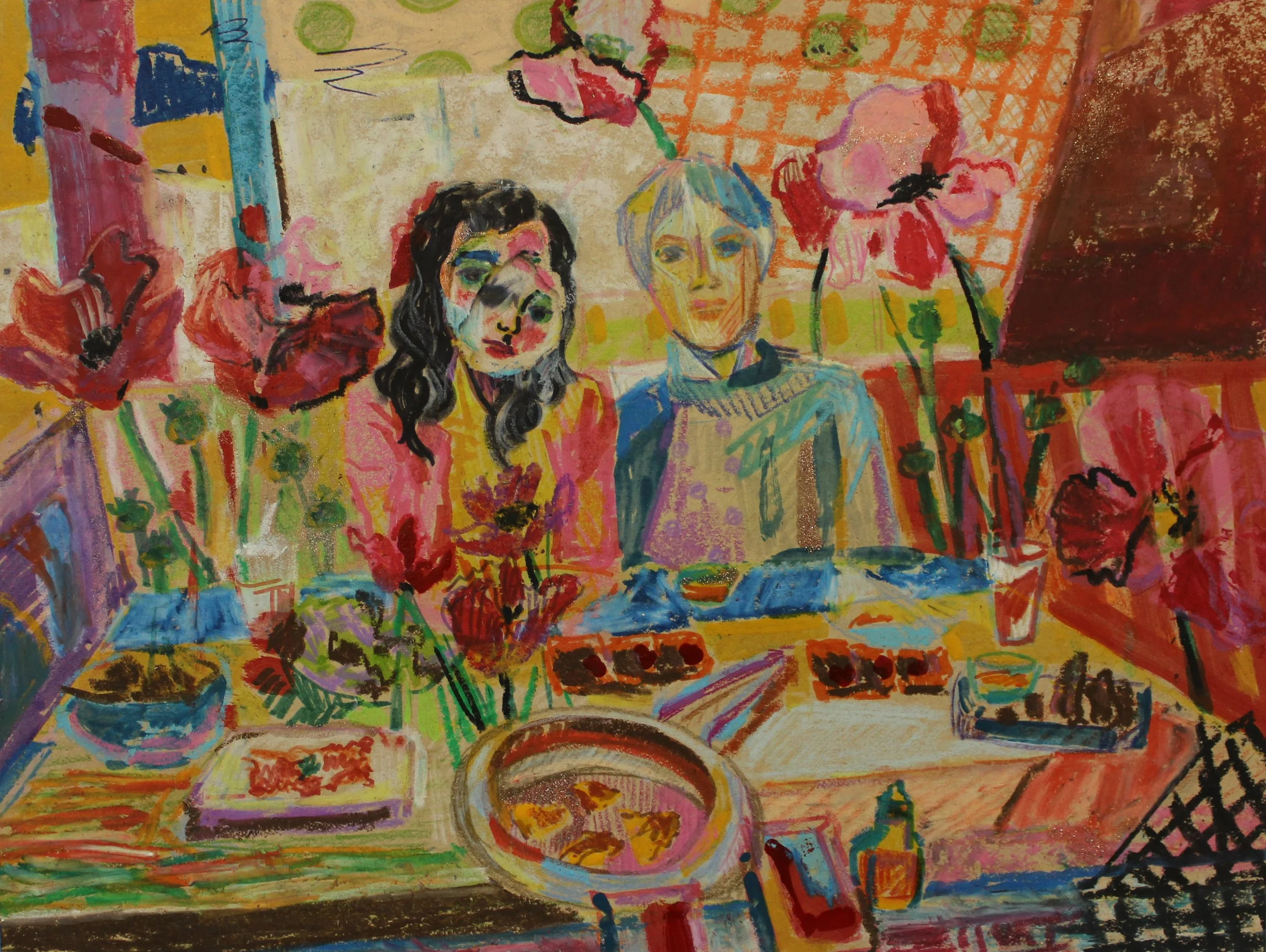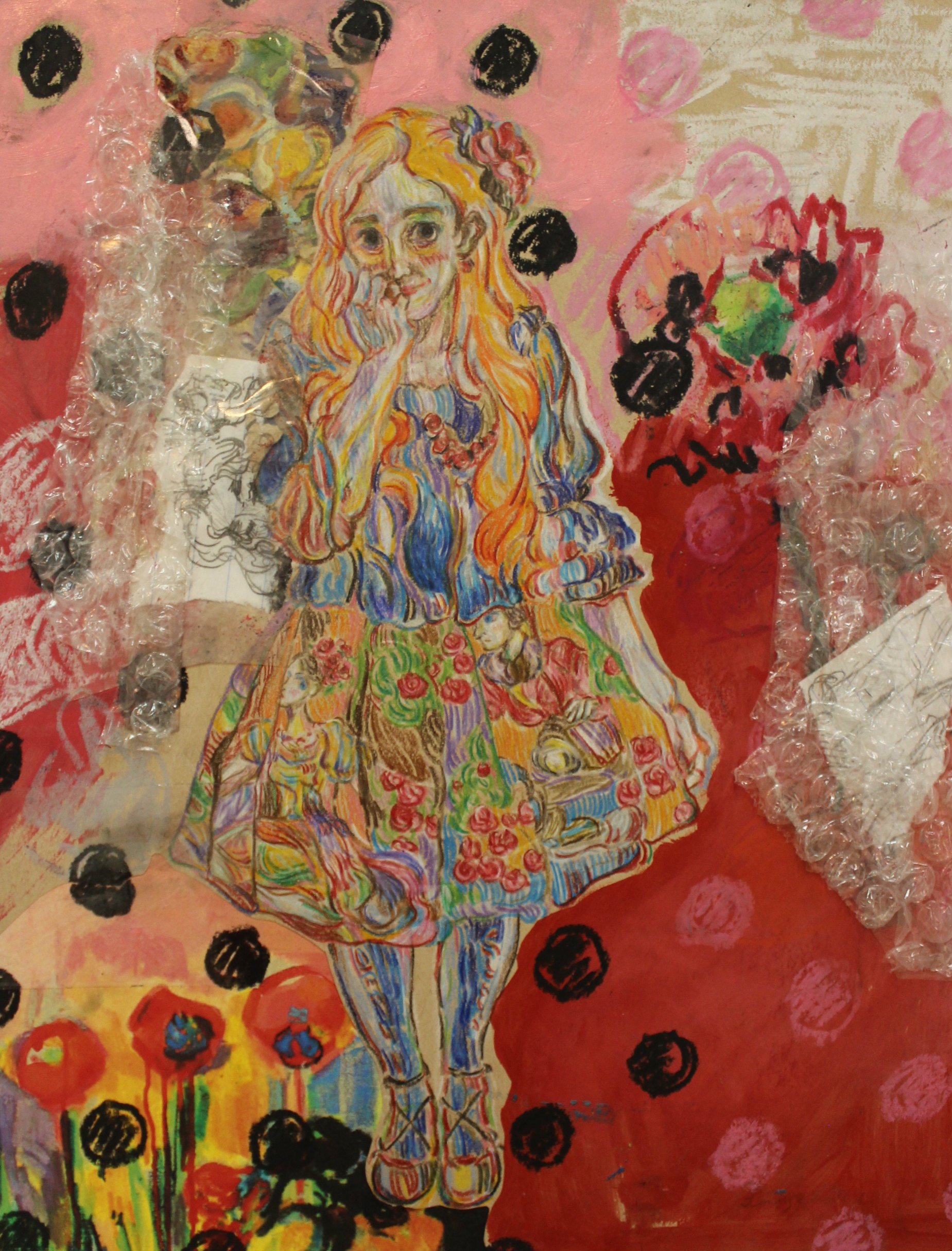 Combining various materials including paint, pastels, glue, stickers, book pages, bubble wrap and found objects on toned paper drawings.
